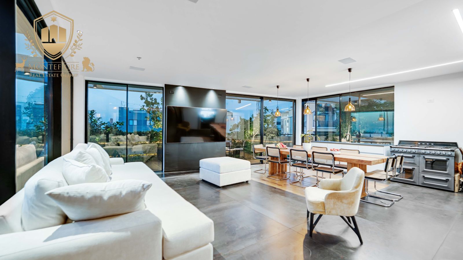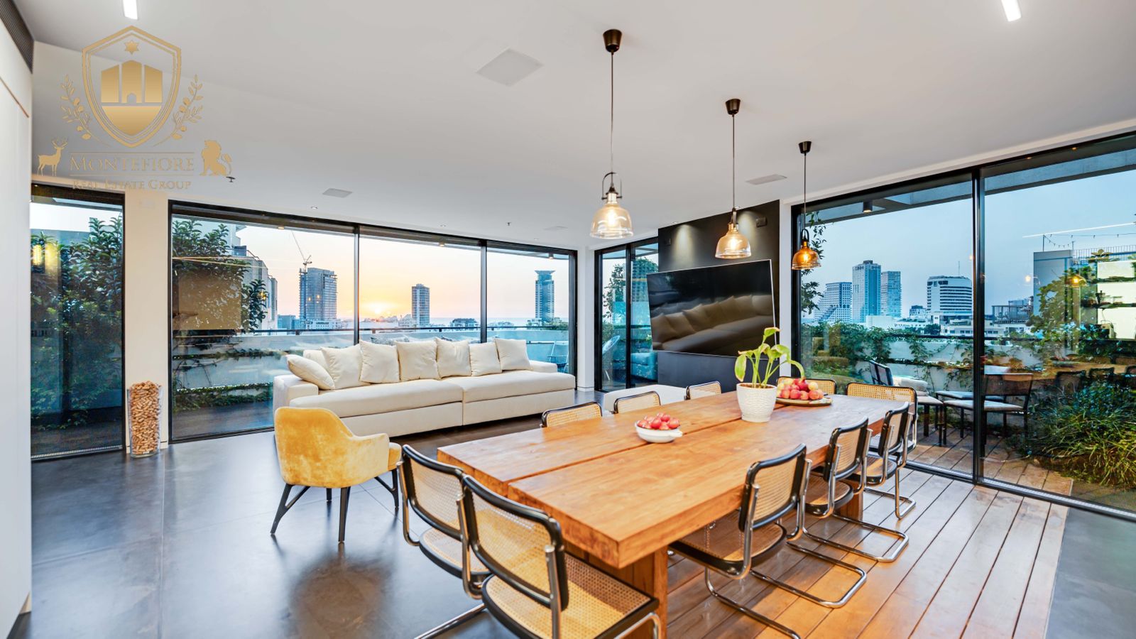 - 5 חדרים הכוללים סלון מרווח ומעוצב עם ויטרינות גדולות מהרצפה לתקרה המאפשרות לראות את הים והשקיעות תוך כדי רביצה על הספה ובישול במטבח
