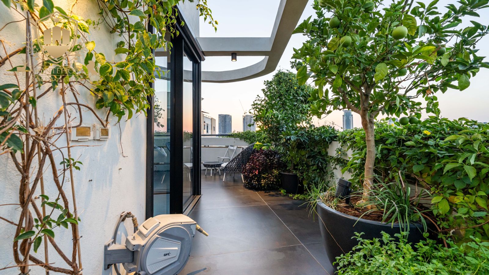 - גינה ירוקה במרפסת ובגג עם מערכות השקייה אוטומטיות מתקדמות. בגינות ניתן למצוא עצי זית, אשכוליות, תפוזים, לימונים, קלמנטינות, מנגו ועוד.